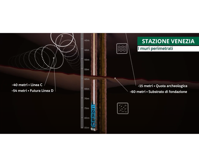 Il video mostra la ricostruzione 3D delle fasi di realizzazione della Stazione Venezia, un unicum che si presenterà come una vera e propria “archeostazione” dove il primo livello interrato sarà dedicato al posizionamento dei reperti rinvenuti nel corso degli scavi.