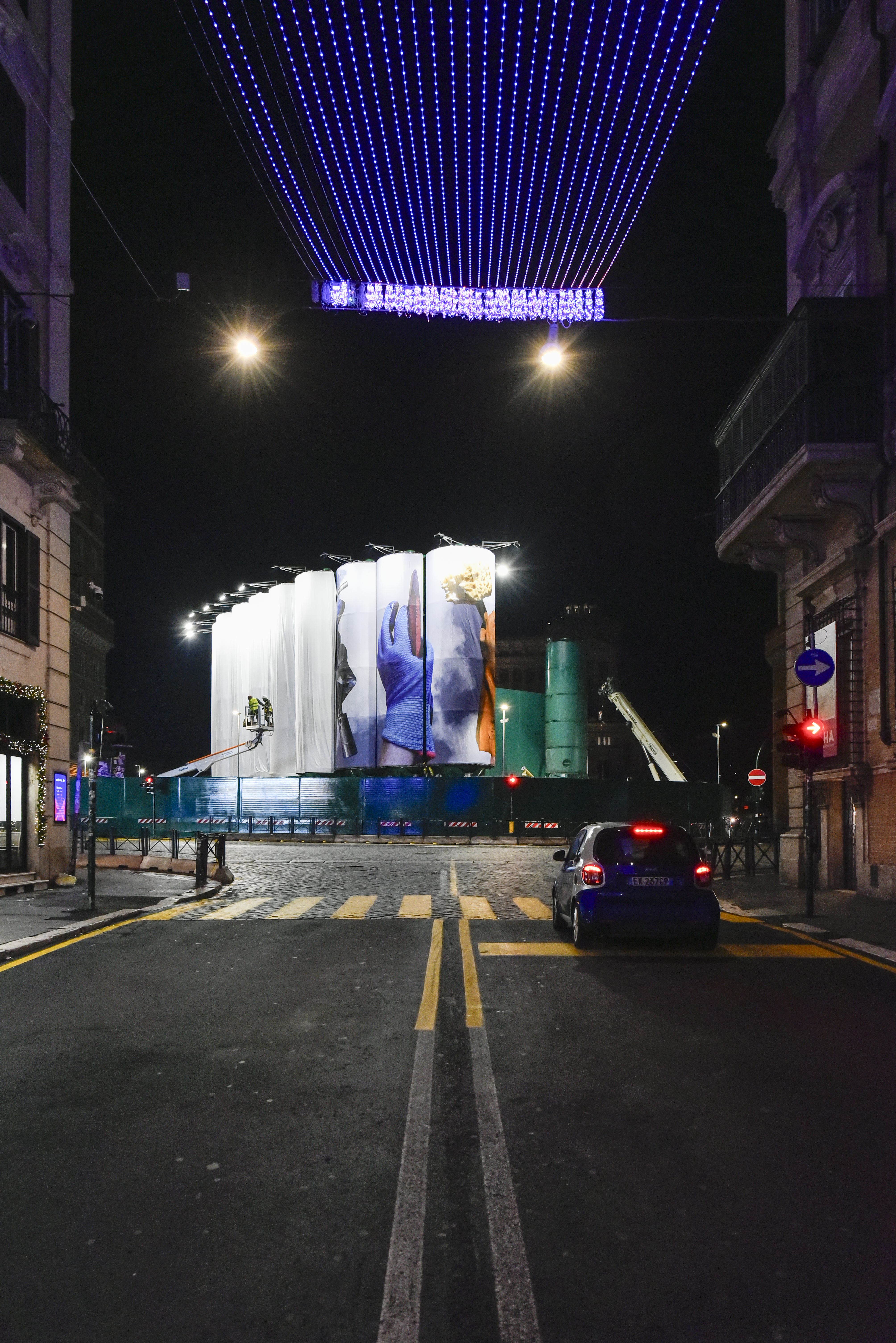 Il lavoro fisico della costruzione visibile in terra è paragonato ad un lavoro intenso e continuo che tende alla trascendenza, attraverso l’evocazione di un legame ideale con la tradizione barocca di Gian Lorenzo Bernini: così come gli angeli marmorei di Ponte Sant’Angelo reggono gli strumenti della Passione di Cristo, gli operai del cantiere tengono in mano strumenti di lavoro, in un’immagine che mostra più livelli di lettura: sacra e laica, antica e contemporanea.