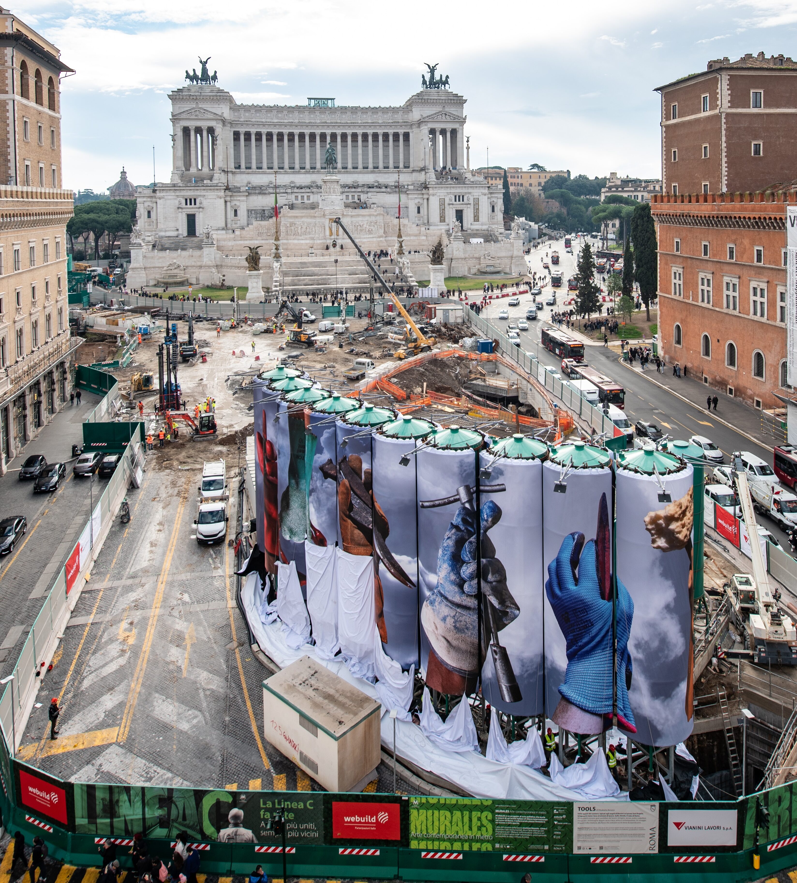 Il progetto Murales, promosso dalle società costituenti Metro C s.c.p.a, Webuild, Vianini Lavori, Hitachi Rail, CCC, CMB e con il patrocinio di Roma Capitale, trasforma i silos industriali in elementi artistici, raccontando il dialogo tra passato, presente e futuro della città. Dopo le opere di Pietro Ruffo e Marinella Senatore, attraverso “TOOLS”, Elisabetta Benassi ci conduce simbolicamente nel cuore del cantiere di Piazza Venezia, inteso come luogo di lavoro e di trasformazione, dove i protagonisti sono gli stessi operai con tutto il loro impegno quotidiano. L’opera celebra perciò il sapere che passa attraverso le mani degli operai che stringono gli strumenti del lavoro quotidiano per costruire in maniera visibile la futura stazione che sarà a servizio della capitale.