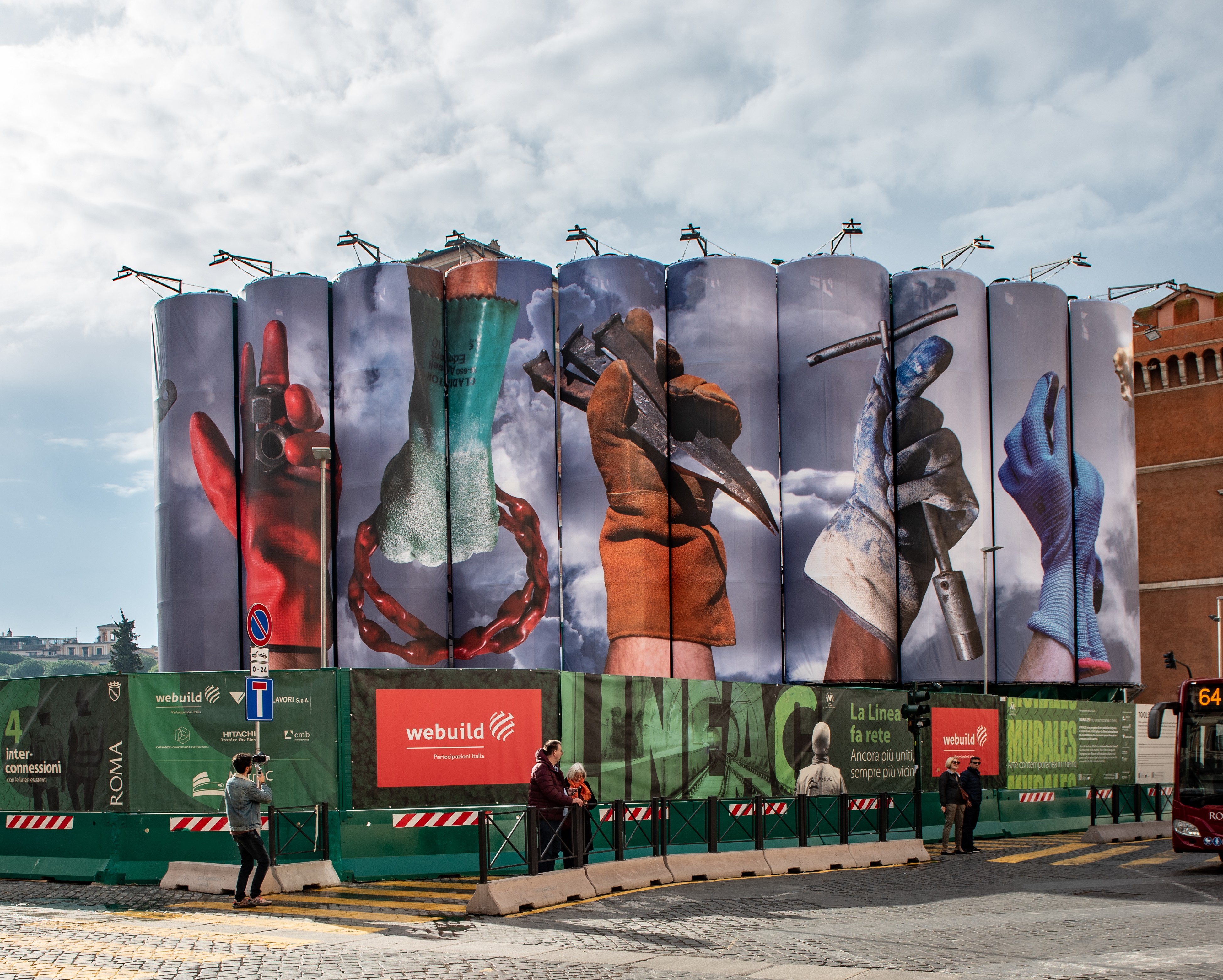 Nuova installazione per il progetto di mitigazione del cantiere stazione Venezia della Linea C della metropolitana di Roma “Murales arte contemporanea in metro”. La società Metro C, guidata da Webuild e Vianini Lavori, impegnata nella costruzione della terza metropolitana di Roma presenta oggi la terza opera artistica posta sui 10 silos in Piazza Venezia, dal titolo “TOOLS”,realizzata da Elisabetta Benassi.
